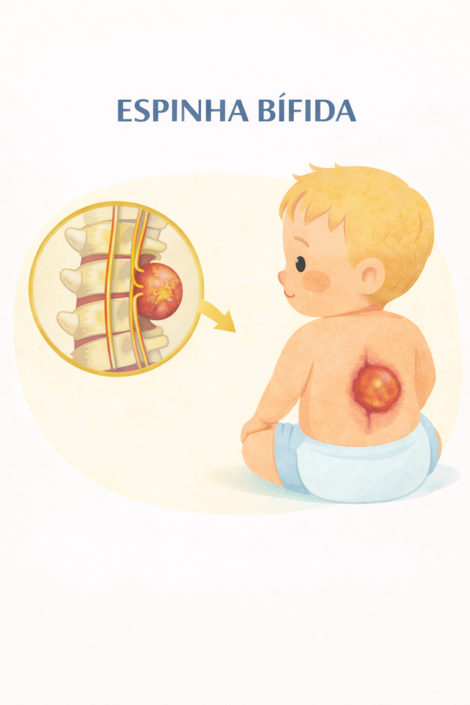 A espinha bífida é um defeito congênito do tubo neural que ocorre quando a coluna vertebral do feto não se fecha completamente durante o primeiro mês de gestação. Pode variar de formas leves e assintomáticas até formas graves com exposição de nervos e complicações neurológicas.